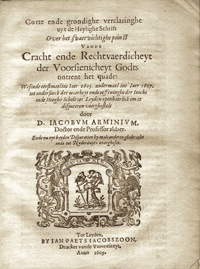 Bibliografia: G.O. McCulloh, Man’s Faith and Freedom: The theological Influence of Jacobus Arminius, New York, Abingdon Press 1962; J.M. Hicks, The Theology of Grace in the Thought of Jacobus Arminius and Philip van Limborch: A Study in the Development of seventeenth-century Dutch Arminianism, dissertation, Philadelphia 1985; C. Bangs, Arminius: A Study in the Dutch Reformation, Grand Rapids (MI), Francis Asbury Press 1985; The works of James Arminius: the London edition, translated by J. Nichols and W. Nichols, introduction by C. Bangs, reprint, 3 vol., Grand Rapids (MI), Baker Book House 1986; P.O.G. White, Predestination, Policy and Polemic: Conflict and Consensus in the English Church from the Reformation to the Civil War, Cambridge, Cambridge University Press 1992; K.D. Stanglin, To comfort the afflicted and upset the secure: Jacobus Arminius and the Roots of the Leiden Debate over the Assurance of Salvation, dissertation, 2006; F.S. Clarke, The Ground of Election: Jacobus Arminius’ Doctrine of the Work and Person of Christ, Bletchley-Waynesboro (GA), Milton Keynes-Paternoster 2006; R.E. Olson, Arminian Theology: Myths and Realities, Downers Grove (IL), IVP Academic 2006; K.D. Stanglin, Arminius on the Assurance of Salvation: the Context, Roots, and Shape of the Leiden Debate, 1603 1609, Leiden, Brill 2007.