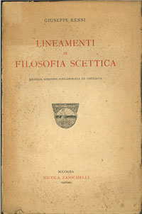 Bibliografia: A. Tilgher, Giuseppe Rensi o la rivolta contro il reale, in Filosofi e moralisti del Novecento, Roma, Libreria di Scienze e Lettere 1932, pp. 286-294; C. Mignone, Rensi, Leopardi e Pascal, Milano, Corbaccio 1954; P. Nonis, La scepsi etica di Giuseppe Rensi, Roma, Studium 1957; G. Morra, Scetticismo e misticismo nel pensiero di Giuseppe Rensi, Siracusa, Ciranna 1958; M.F. Sciacca (a cura di), Atti della “Giornata Rensiana”, Milano, Marzorati 1967; R. Chiarenza, N. Emery, M. Novaro, S. Verdino (a cura di), L'inquieto esistere. Atti del convegno su Giuseppe Rensi nel cinquantenario della morte, Genova, EffeEmmeEnne 1993; L. Ronchetti e A. Vigorelli (a cura di), Fondo Giuseppe Rensi. Inventario con una scelta di lettere inedite, Milano, Ed. Cisalpino 1996; N. Emery, Lo sguardo di Sisifo. Giuseppe Rensi e la via italiana alla filosofia della crisi, Settimo Milanese, Marzorati, 1997; P. Serra, Il pensiero politico di Giuseppe Rensi, Milano, Franco Angeli 2000; F. Mancuso, A. Montano (a cura di), Irrazionalismo e impoliticità in Giuseppe Rensi, Soveria Mannelli, Rubettino 2009; F. Meroi, Giuseppe Rensi: filosofia e religione nel primo Novecento, Roma, Edizioni di storia e letteratura 2009; F. Meroi, Rensi, Giuseppe, in Il Contributo italiano alla storia del Pensiero - Filosofia (2012); F. Meroi, RENSI, Giuseppe, in Dizionario Biografico degli Italiani (2016); D. Gurashi, Giuseppe Rensi. Filosofo delle storia, Firenze, Le Lettere 2017.