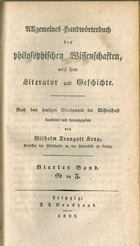 Verzeichniß der von Hrn. Prof. D. W.T. Krug Ritter mehrerer Orden, hinterlassenen ansehnlichen Bibliothek, welche nebst mehreren, Bücher aus allen Theilen der Wissenschaft enthaltenden Anhängen, vom 12. Novbr. bis 30. Decbr. 1842. durch den verpflichteten Universitäts-Proclamator Carl Ernst Schmidt versteigert werden wird, Leipzig, Eingesandt vom Universitäts-Proclamator C.E. Schmidt 1842, 239 + 272 p., in 8°.