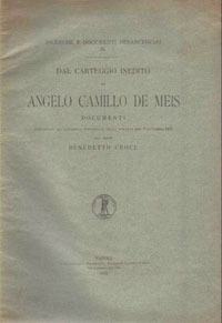 Bibliografia: A. Del Vecchio Veneziani, La vita e l’opera di Angelo Camillo De Meis, Bologna, Zanichelli 1921; U. Russo, Studi sul De Meis e sulla cultura abruzzese tra Otto e Novecento, Pescara, Ed. Trimestre 1975; F. Tessitore, De Meis, Angelo Camillo, in Dizionario Biografico degli Italiani, vol. 38 (1990); L. Mammarella, Storia di un italiano. Angelo Camillo De Meis, Roma, D. Borgia 1991; R. Colapietra, Angelo Camillo De Meis politico “militante”, Napoli, Guida Editori 1993.